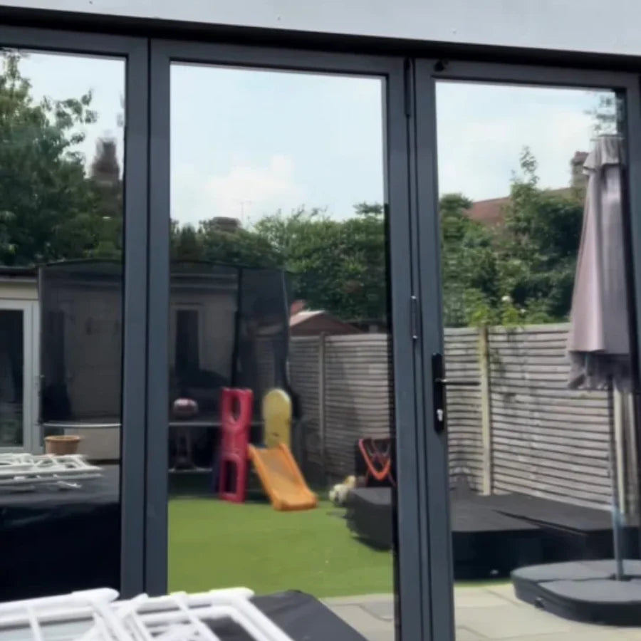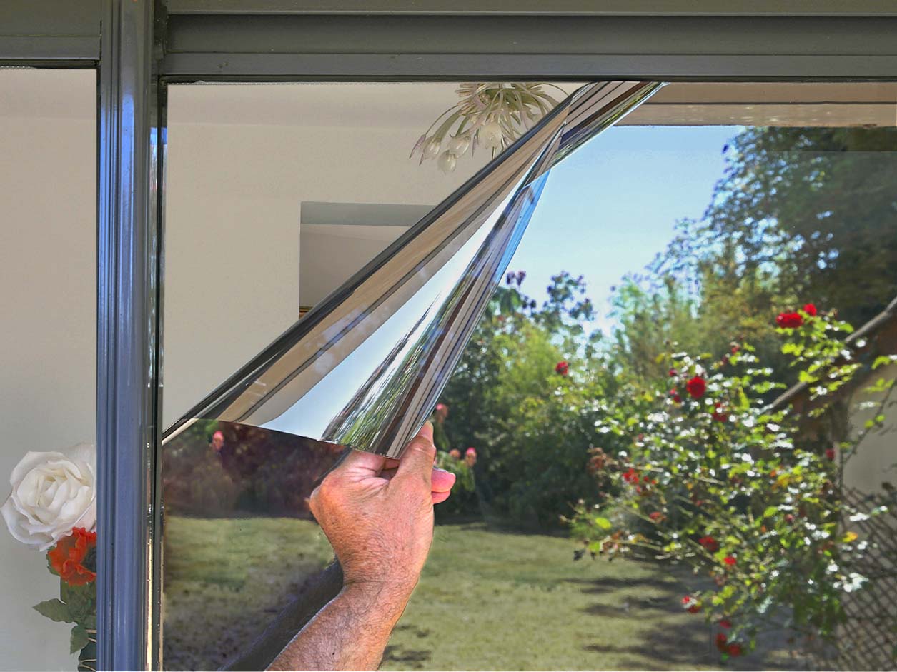 Recomendamos aplicar un vinil adhesivo en la parte exterior del acristalamiento. El vinil será más eficaz y el cristal estará protegido.
