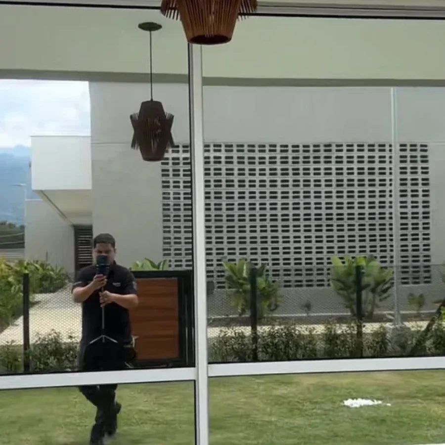 El vinil se pega directo al vidrio, refleja el calor, bloquea rayos UV y mantiene la privacidad durante el día.